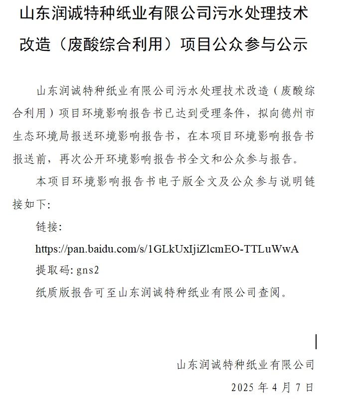 【公示】山东润诚特种纸业有限公司污水处理技术改造(废酸综合利用)项目报批前公示