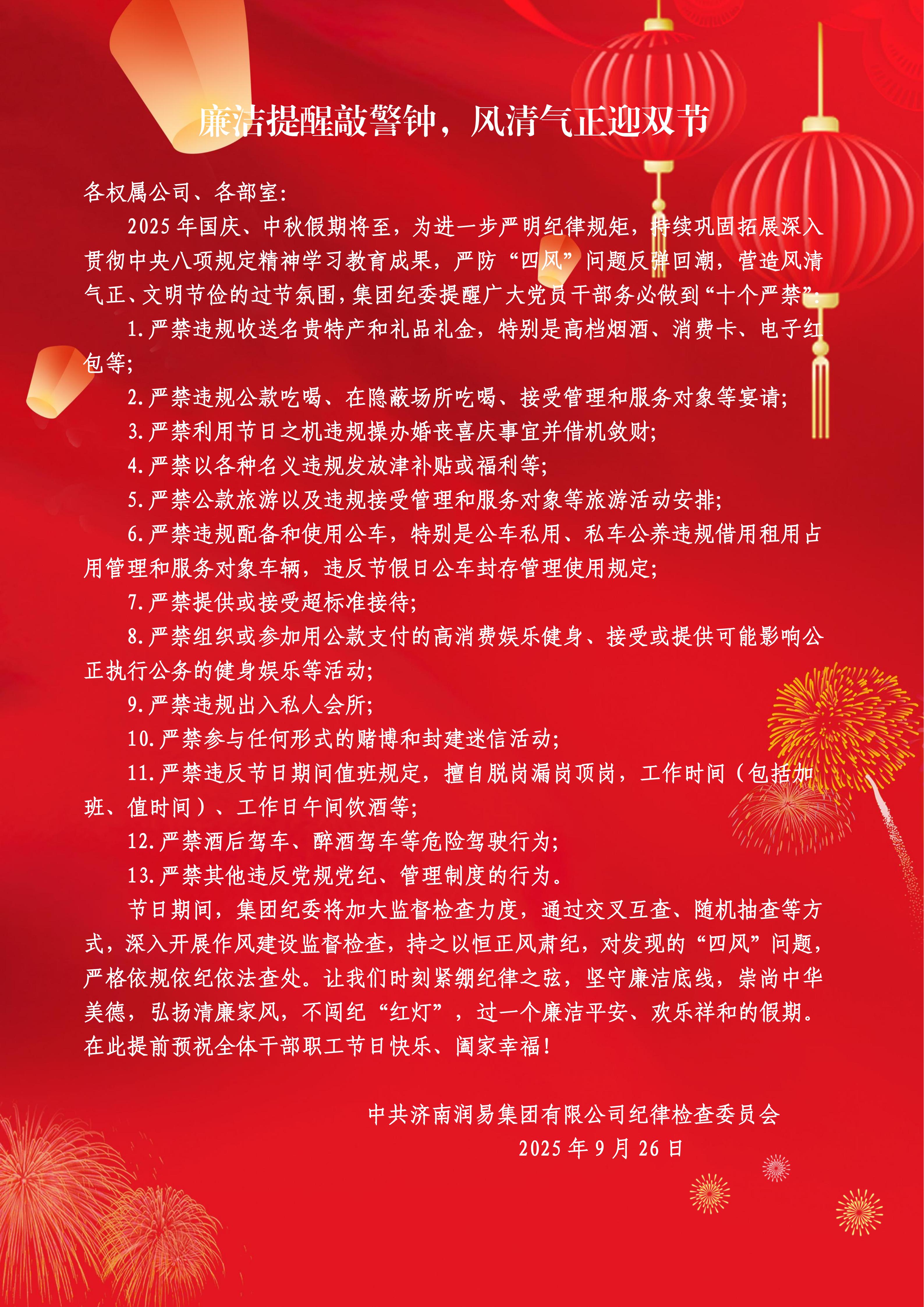 【通知】廉洁提醒敲警钟,风清气正迎双节——2025年国庆、中秋廉洁过节提醒函